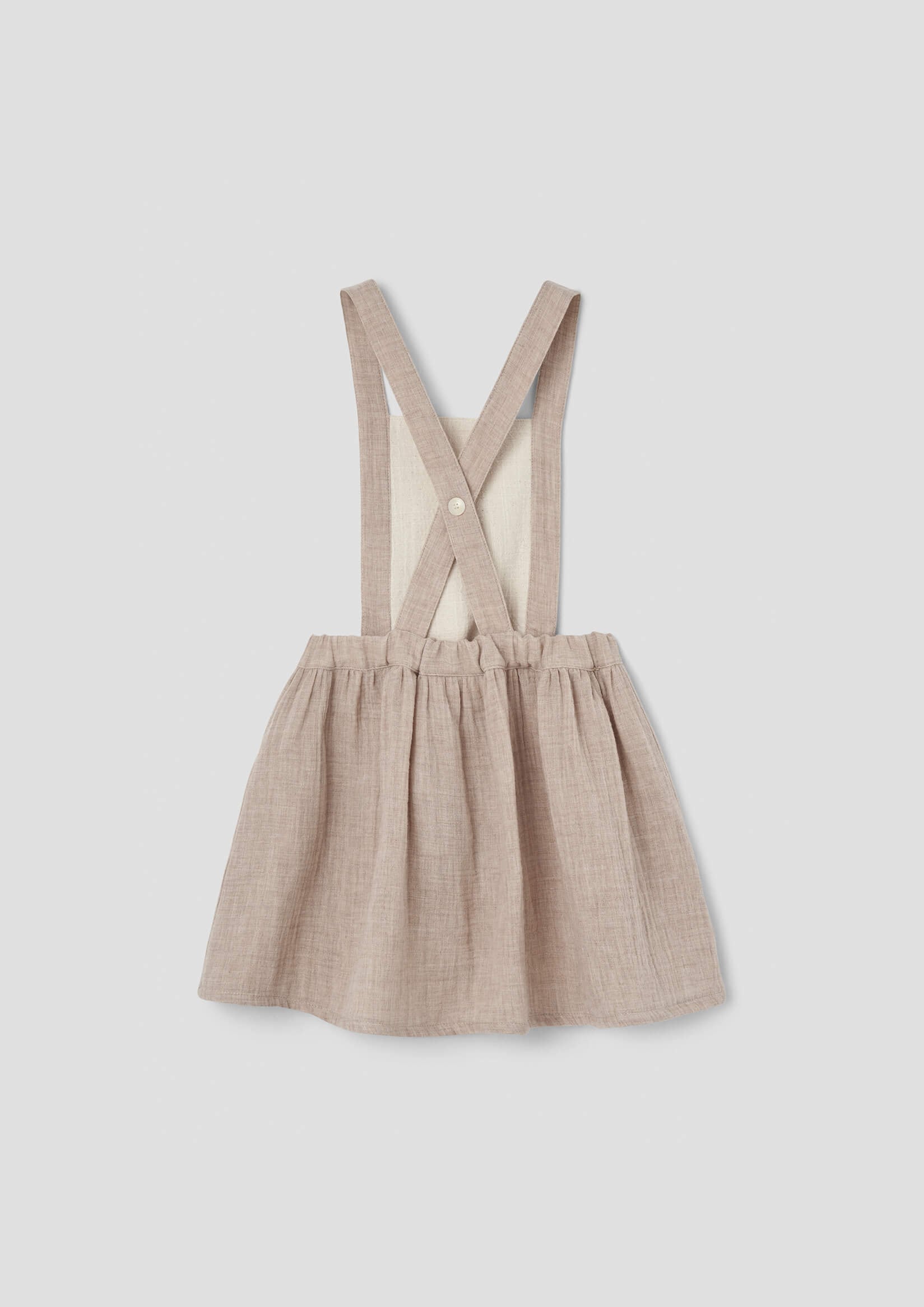 刺繍入りのビブデザインが目を惹く、サスペンダー付きのショートスカート。
